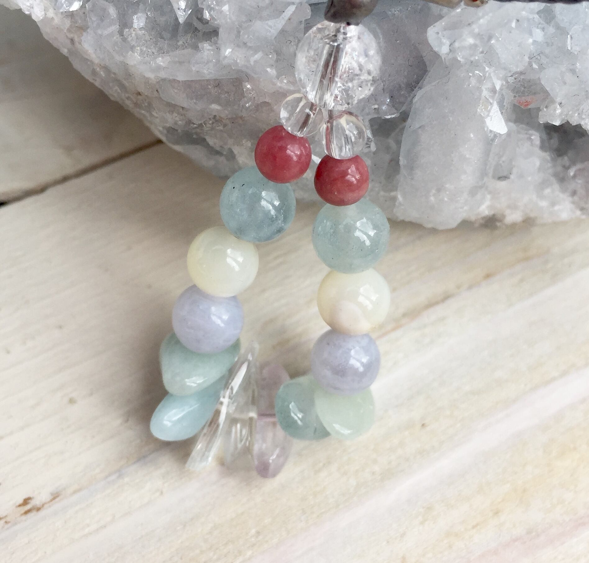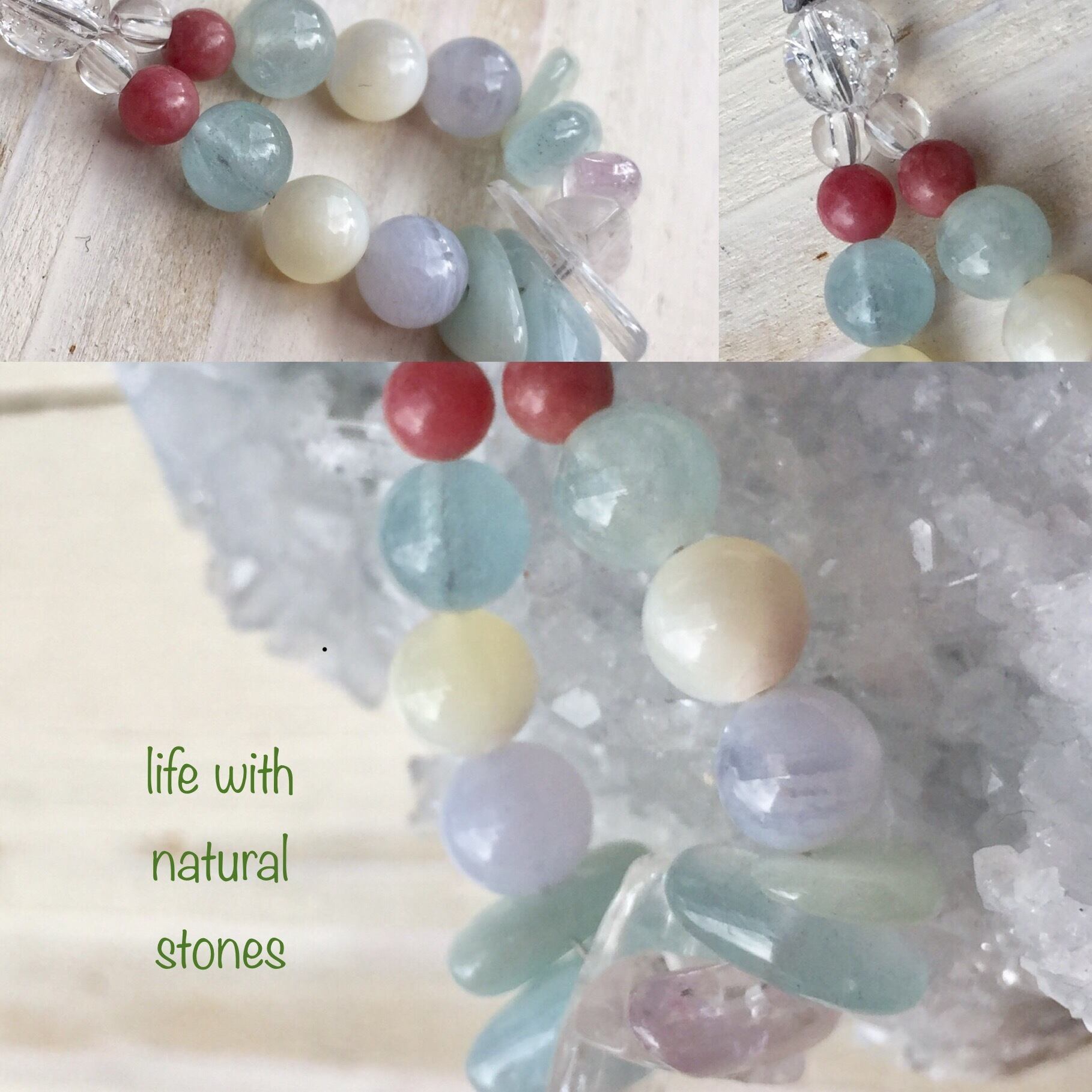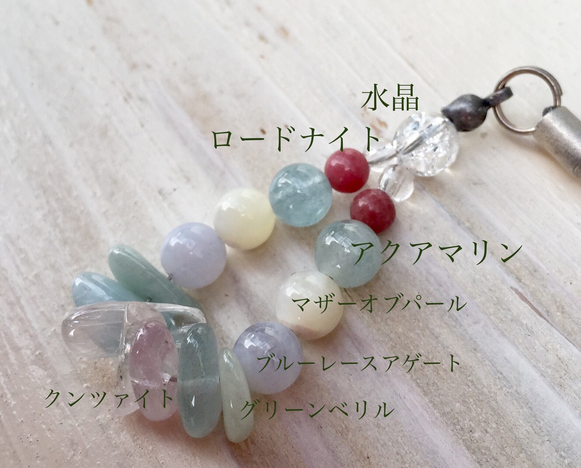 淡い色で作った天然石ストラップです。