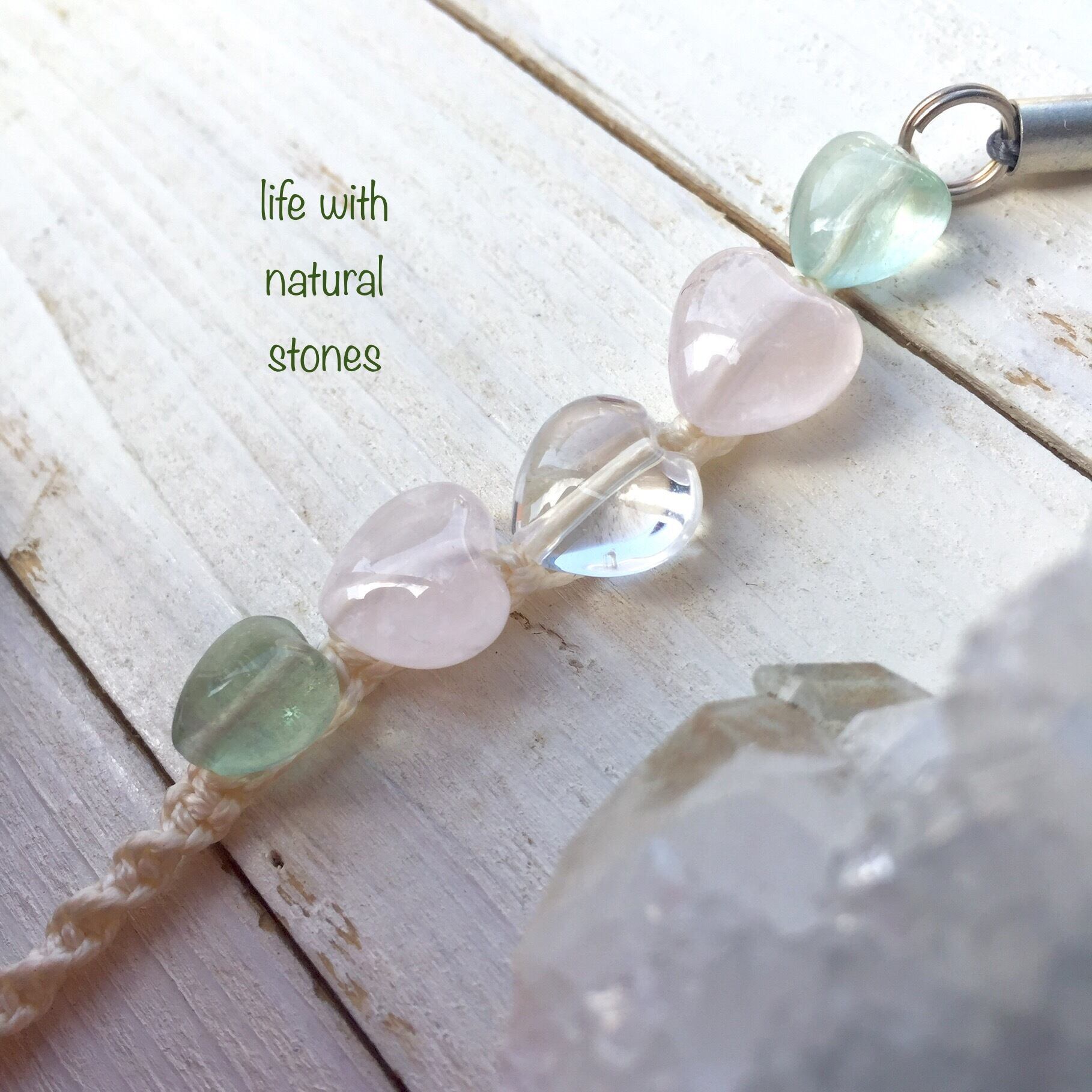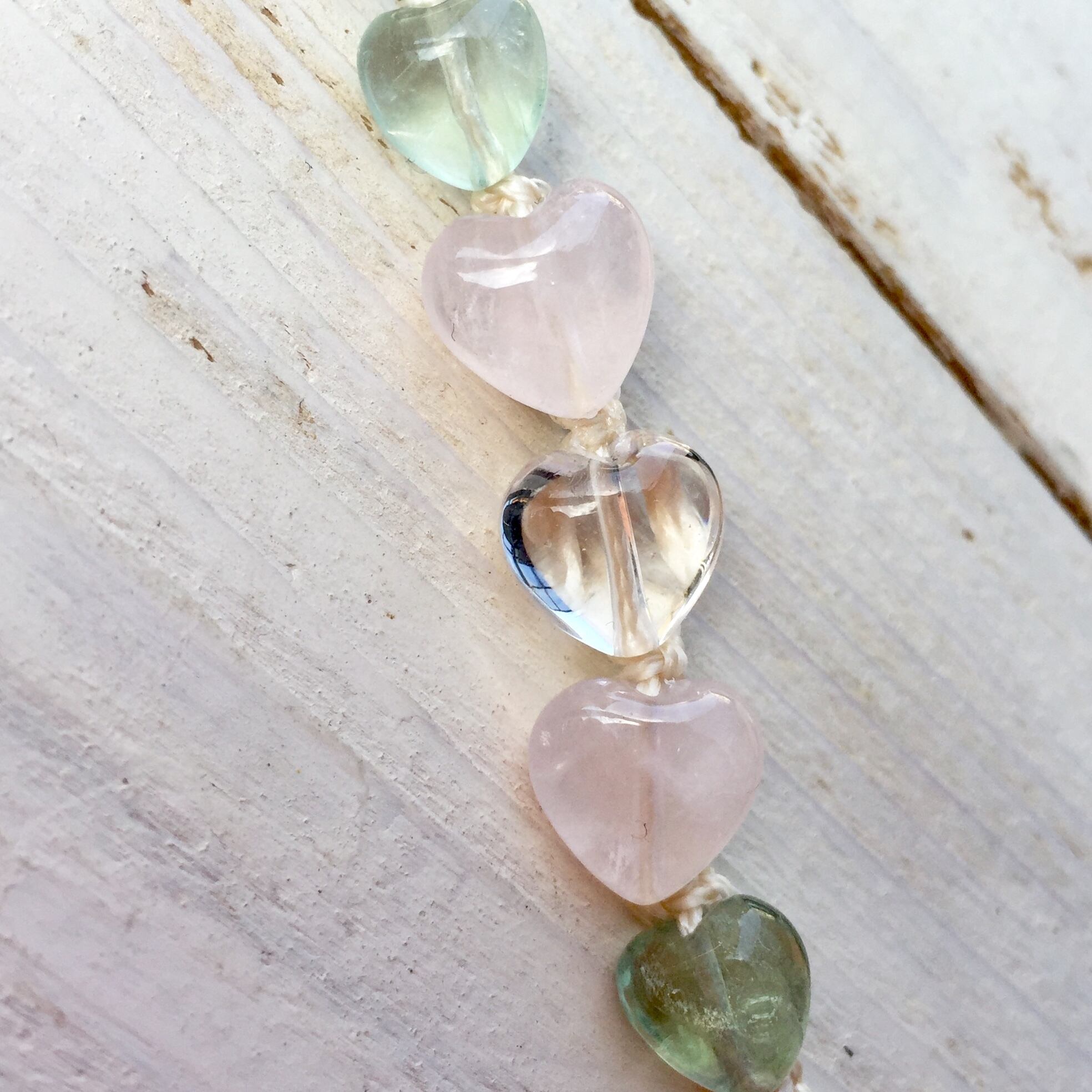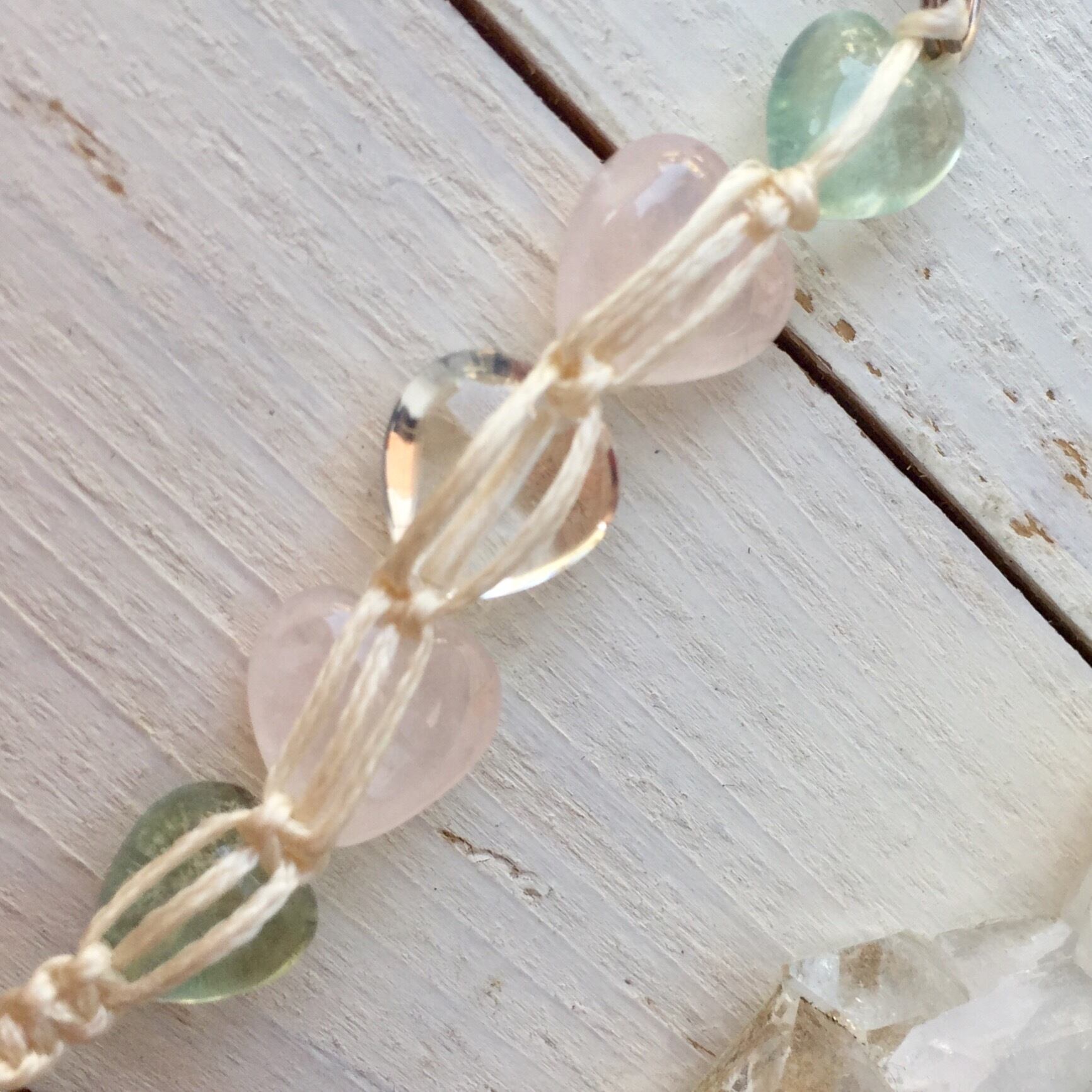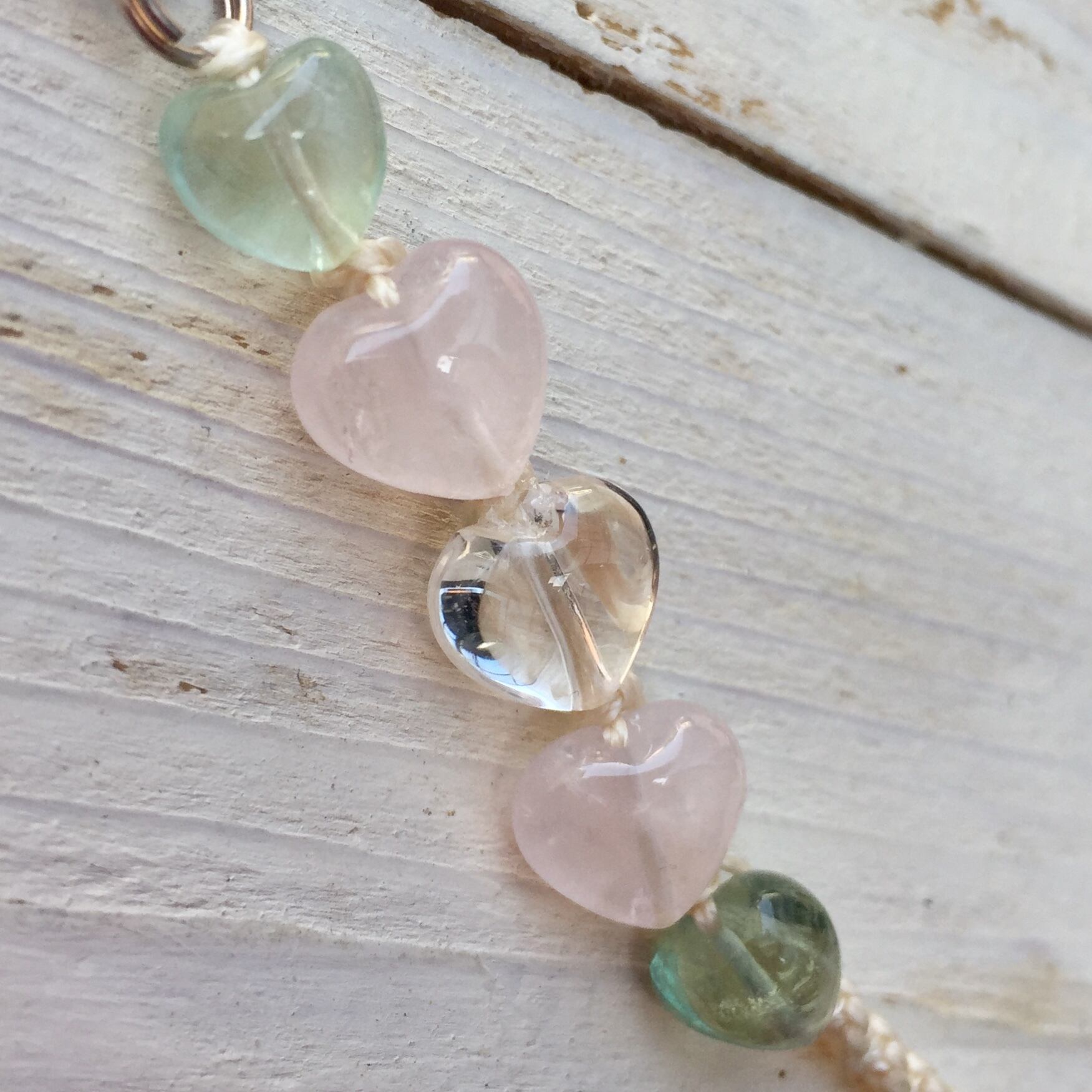 淡い、優しいカラーのハートの天然石を並べて編みました。